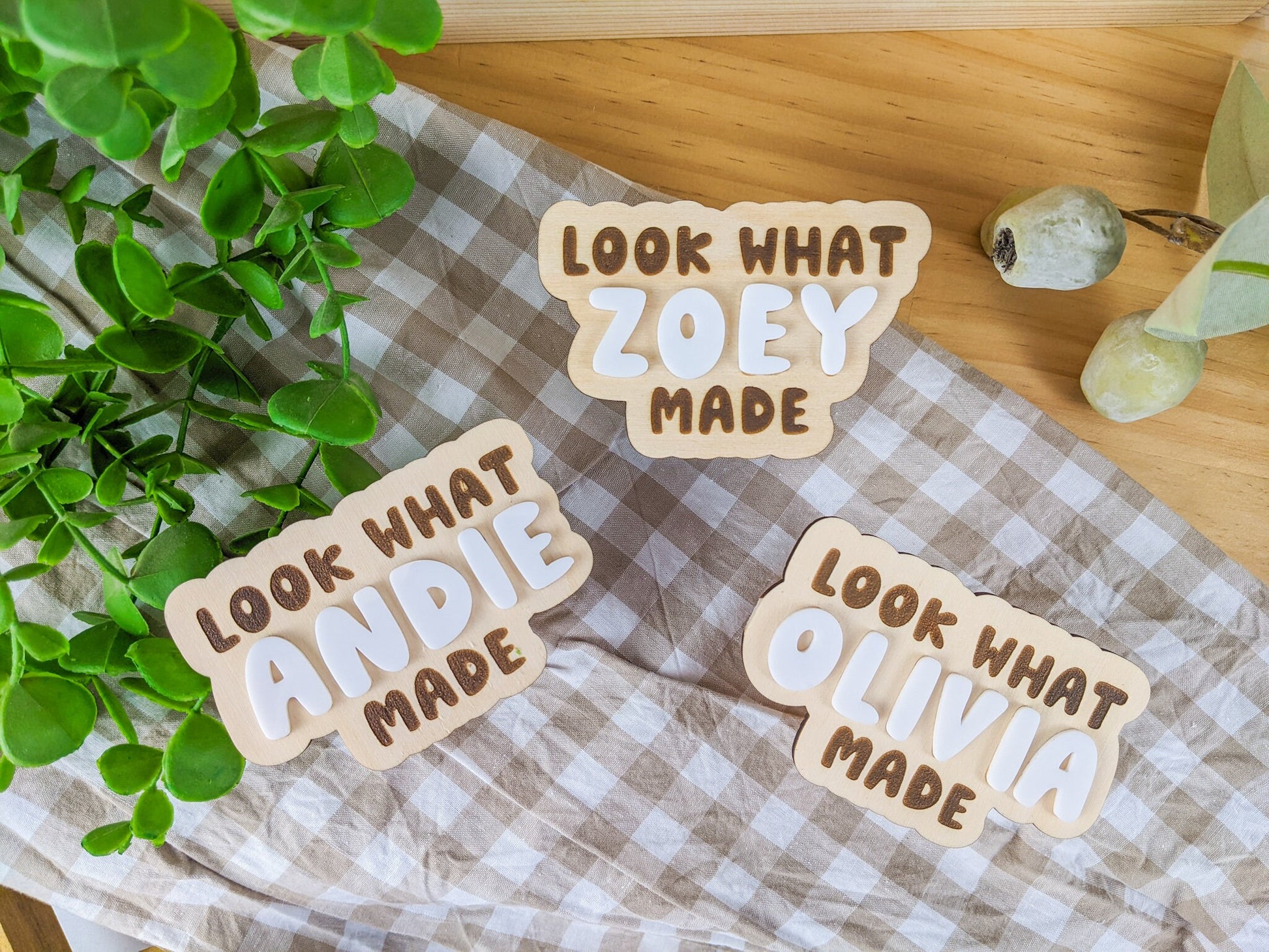The magnet is made using premium 4mm hoop pine, while the name is 2mm white acrylic. On the back we have 2 neodymium magnets to hold the artwork on the fridge.