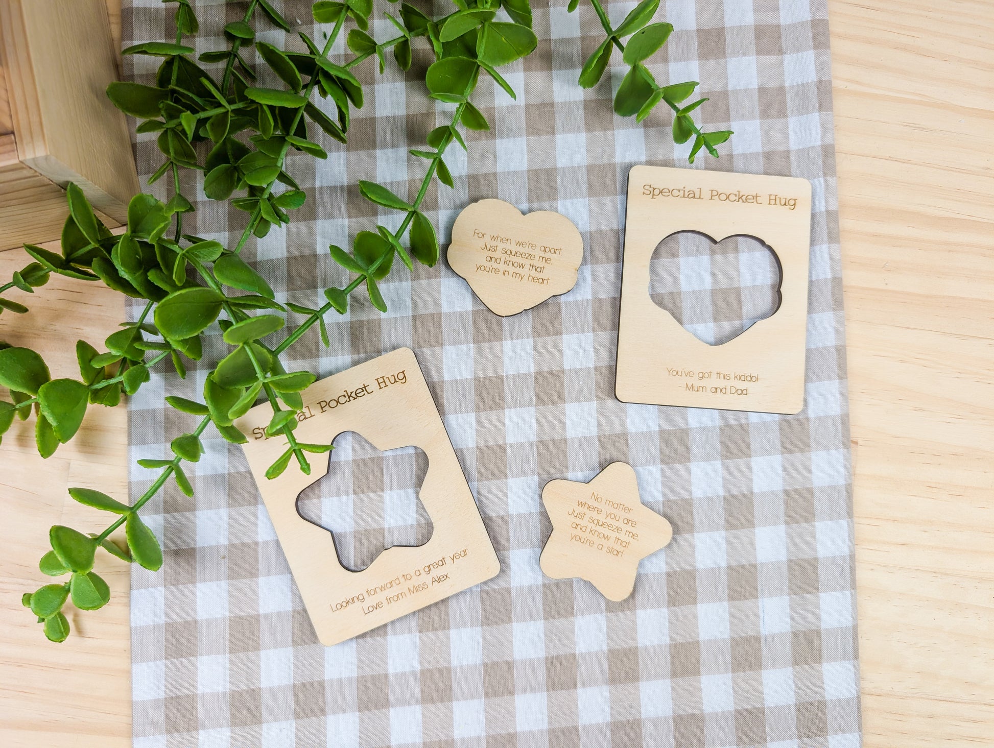 Available in two design options, Heart and Star. Our pocket hug are crafted from 4mm Australian Hoop Pine with nice rounded edges so your pocket linings stay safe.